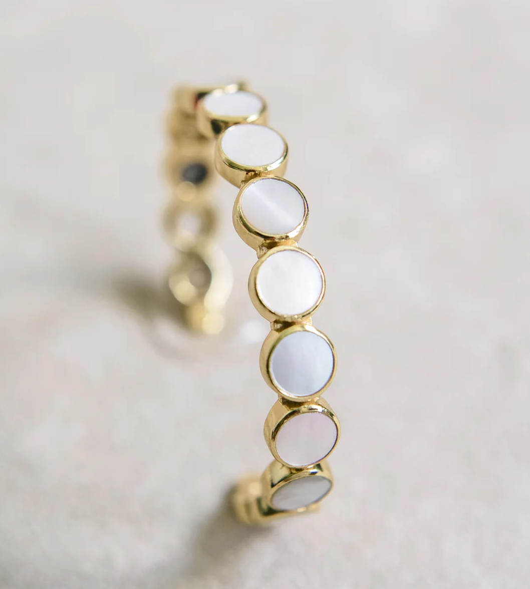 Featuring a row of smooth, round mother of pearl accents set in a classic gold-tone finish, this bracelet is perfect worn alone for a minimalistic look or stacked with your favorite pieces for added flair.