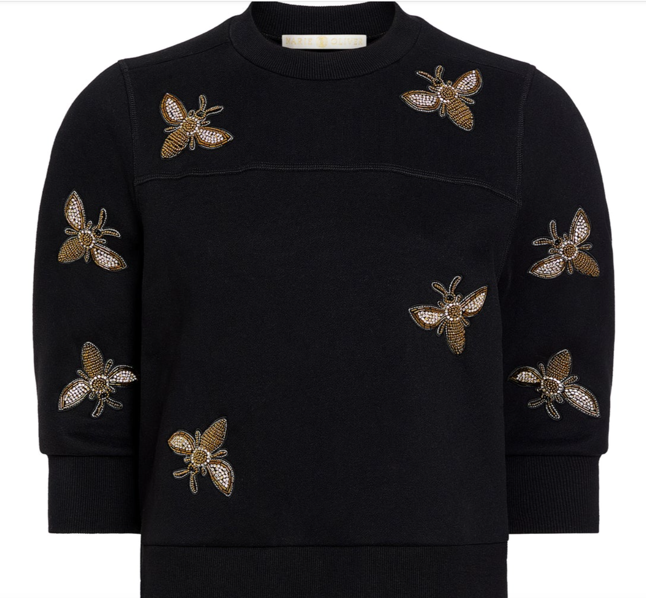 At Marie Oliver, we love a stylish piece that balances both comfort and glamour, especially during the swirl of a busy season. Exhibit A: Our new Ariana sweatshirt. The chic, bracelet sleeve silhouette is embroidered with tiny bejeweled and beaded bees that add just the right dose of playfulness and sparkle. Wear Ariana with our Gilded print Faith Skirt, or dress up your favorite denim.