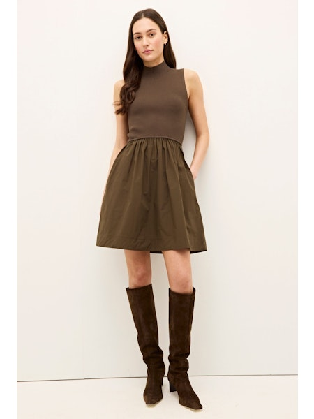 New for the season, our mixed-media Reynolds dress combines comfort and clean lines with a ribbed knit bodice and crisp cotton poplin mini skirt. The easy slip-on silhouette pairs perfectly with boots and a jacket for a polished, fall-ready look.