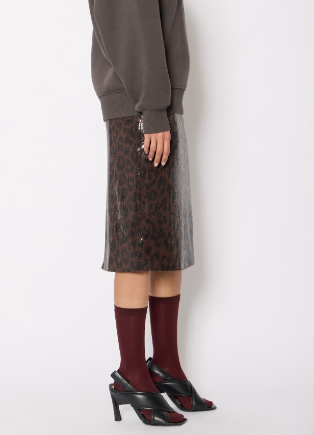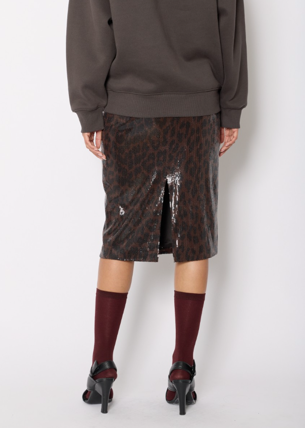 Make a statement with the JAMYLA leopard print midi skirt adorned with sparkling sequins. Its fluid, feminine cut creates elegant movement, while the bold leopard print and shimmering sequins give it a glamorous edge. Perfect to brighten up your daytime or evening outfits.