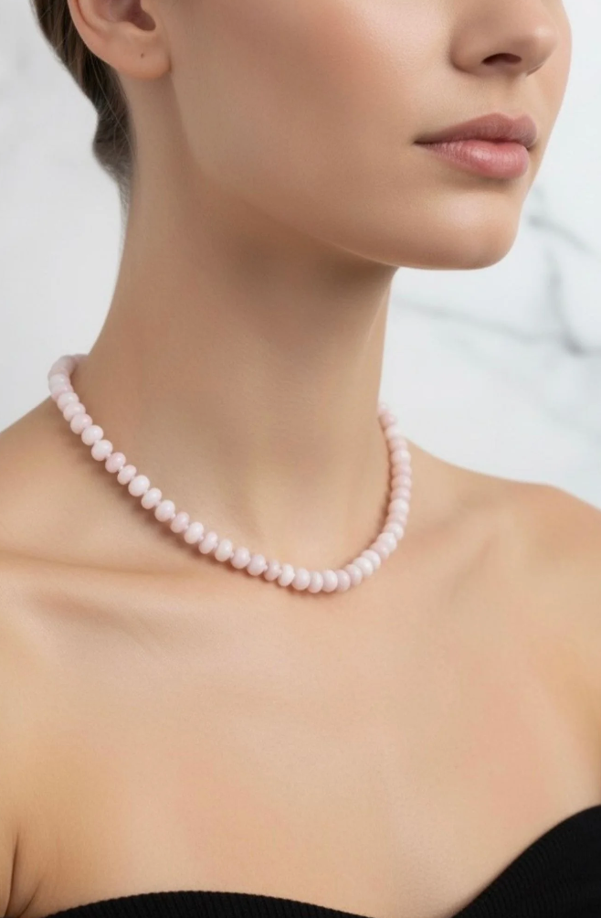 The Viondra Necklace features a harmonious blend of pink glass opal beads paired with soft pink agate glass spacers. This thoughtfully designed piece offers a gentle pop of color that supports your natural elegance and brings a sense of calm and beauty to any look. A versatile accessory to uplift your everyday wardrobe.