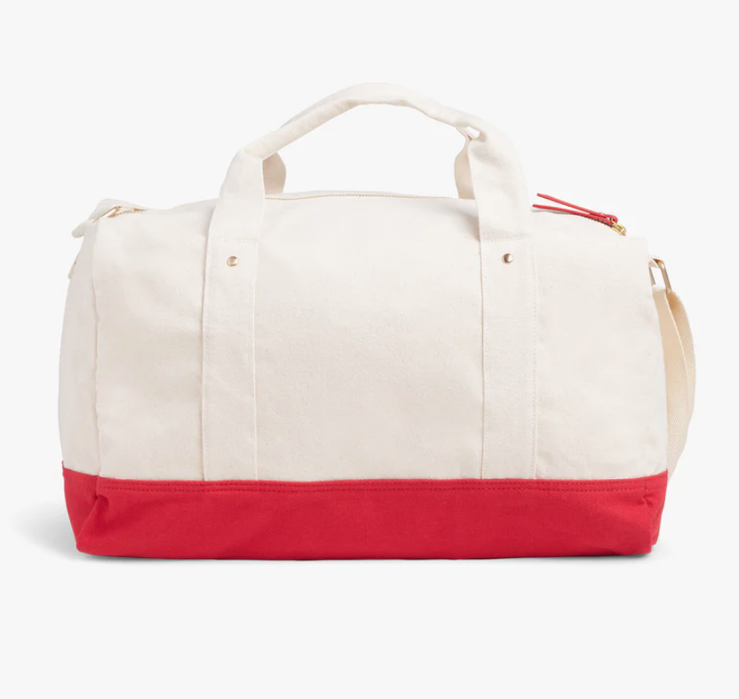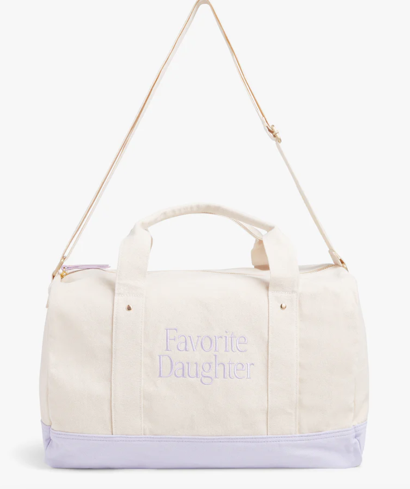 Meet your go-to weekend bag. Crafted from durable cotton canvas with an adjustable strap and a red base, this duffle is a classic. The Favorite Daughter logo makes it perfect for your next family reunion—or wherever the weekend takes you. Stocked in bright red or soft purple lilac.