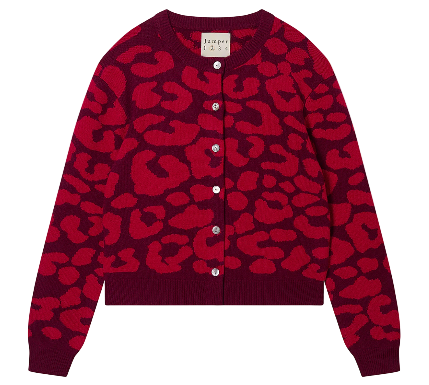 100% merino wool in a soft and substantial knit, all over leopard jacquard in burgundy and red. Ribbed crew neck, cuffs and hem in burgundy, long sleeved button front cardigan, not too boxy, not too cropped, just right!