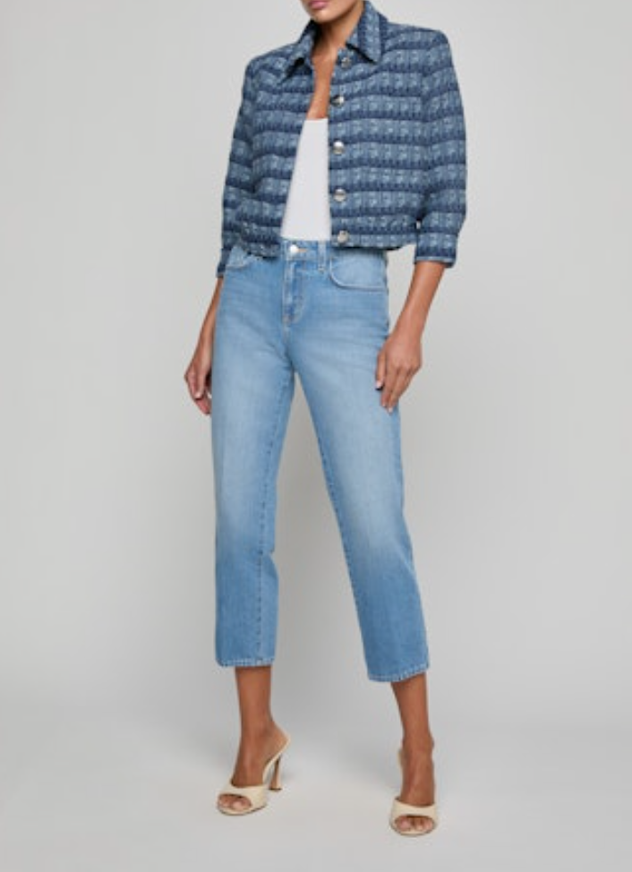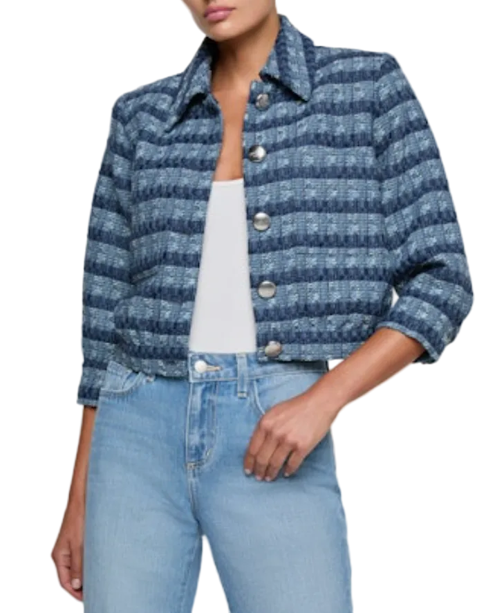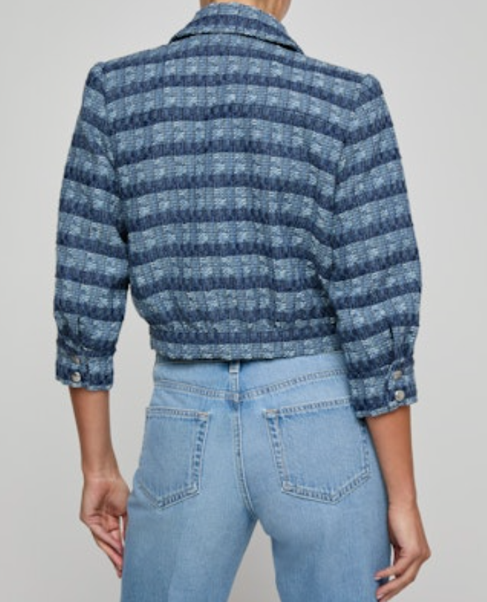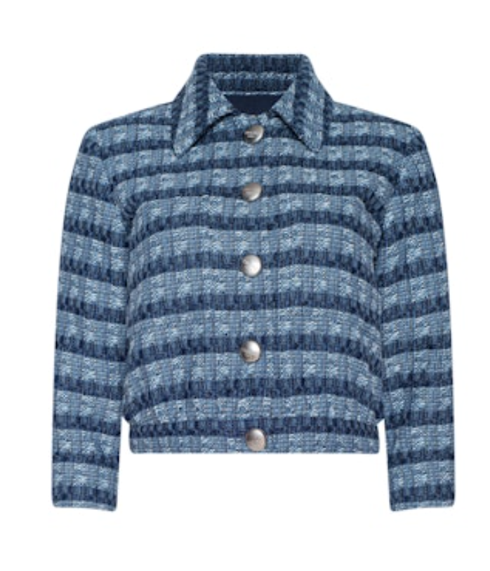 A ladylike, three-quarter sleeve jacket crafted from a lightweight textured tweed in stripes and shades of blue and finished in a chic, cropped length with matte silver signature buttons. Wear the Jia as a top or second layer - pairs perfectly with any denim wash!