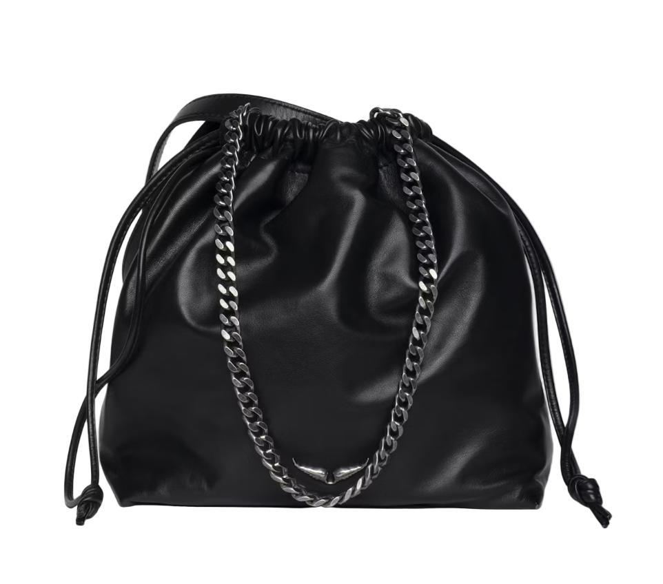 Slouchy lambskin leather bag with gunmetal chain strap and wing signature. Drawstring closure with leather shoulder/crossbody strap, fully lined in cotton twill with zipped interior pocket.