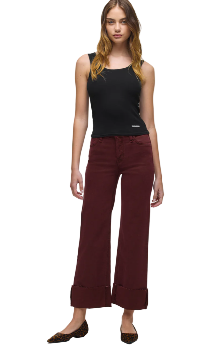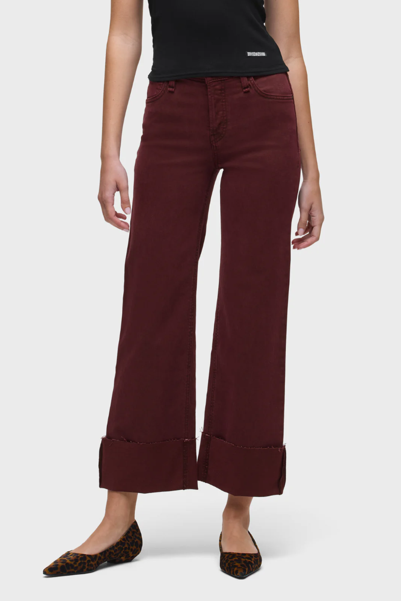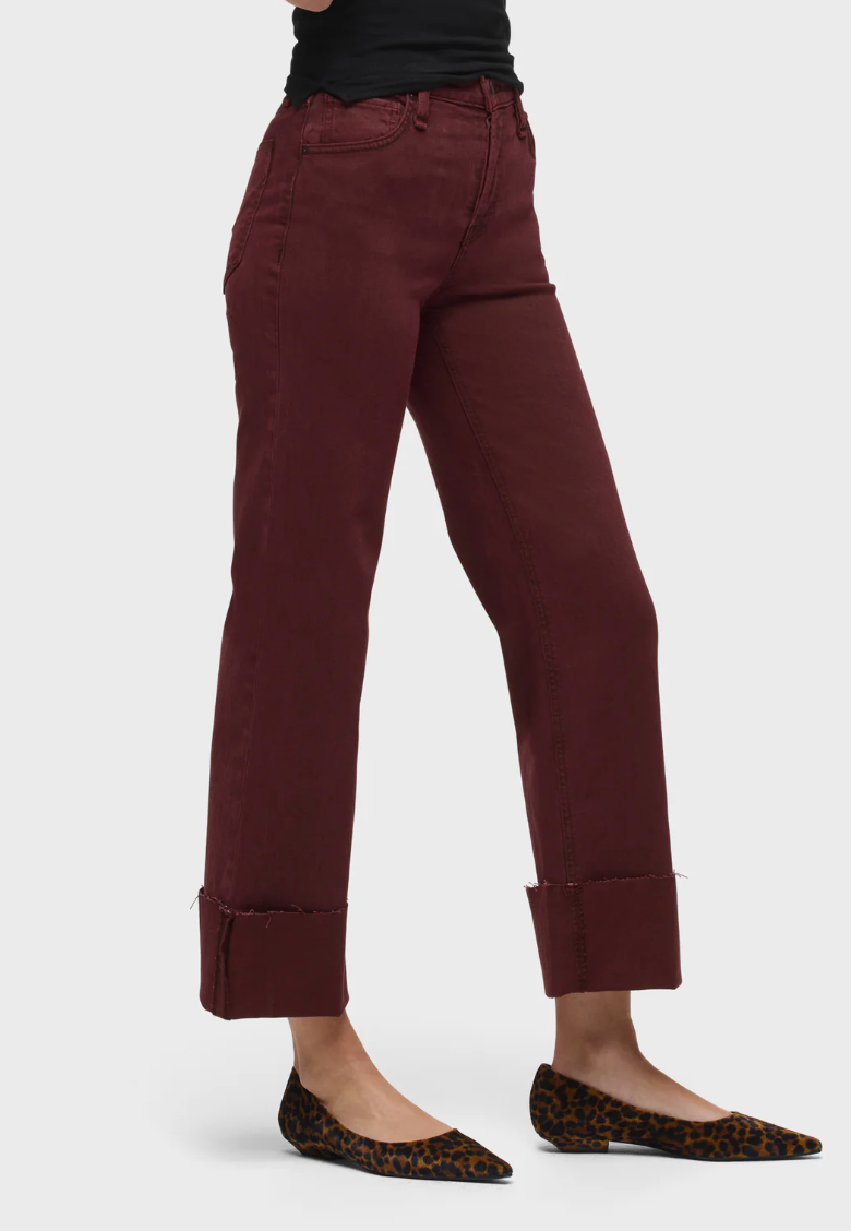Our Rosie High-Rise Wide Leg with Cuff in Port Royal has a classic fit with an elevated waistline and a roomy leg. Crafted in overdyed deep burgundy stretch fabric, this full-length 32" pair is finished with a 5" cuff, raw hem and covered tonal button fly.