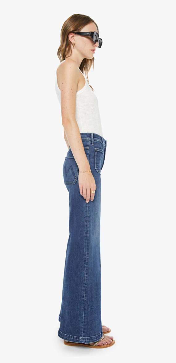 Hail Mary. 70s-inspired wide leg jeans with a high rise, zip fly, patch pockets, 31-inch inseam and a clean hem. Made from stretch denim, One Last Shot is a dark blue with subtle whiskering and fading at the knees.